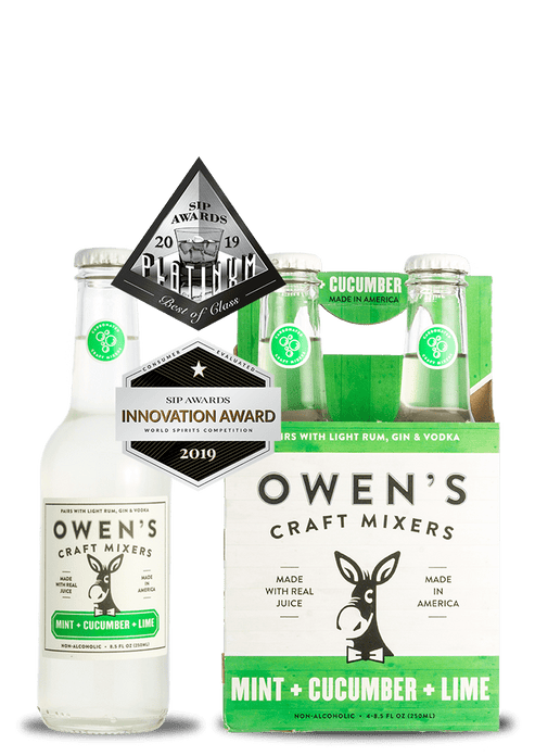 Owen's Mint + Cucumber + Lime is a premium cocktail mixer made the in the USA with high quality, real ingredients. Designed to provide a well-balanced, multi-ingredient, refreshing flavor combination that is an easy to drink cocktail when combined with any clear spirits. This mixer also makes a refreshing Cucumber Julep when mixed with Bourbon. Owen's Mint + Cucumber + Lime is a fan favorite and won the 2019 "Best of Class, Platinum" Sip Award for Carbonated Mixers.