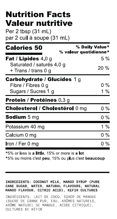 Mango: Coconut milk, mango syrup (pure cane sugar, water, natural flavors, natural mango flavor, citric acid), kefir cultures
