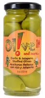 A slice of Jalapeño pepper and a crunchy garlic clove hand stuffed in our fantastic Sevillano green olives. A spicy delight!
