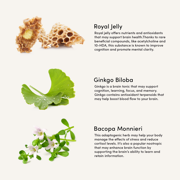 Royal jelly (500mg), bacopa monnieri plant extract (300mg), ginkgo biloba leaf extract (400mg), non-GMO vegetable glycerin, and purified water.