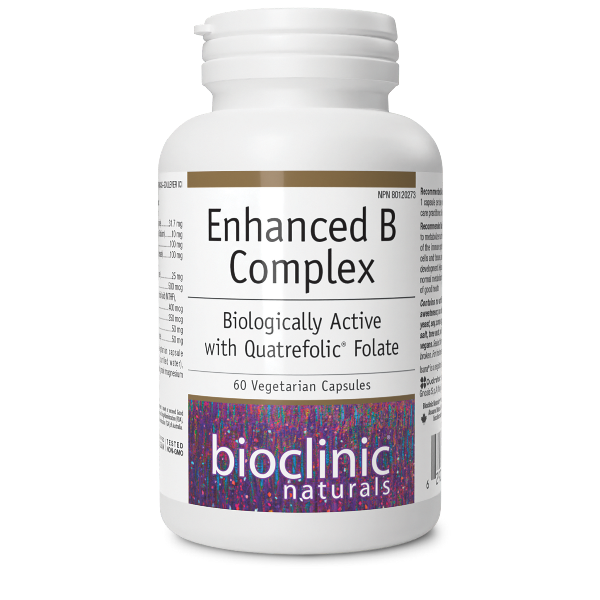 Enhanced B Complex from Bioclinic Naturals is a one-per-day formula providing full-spectrum B vitamins in their most metabolically active forms. B vitamins are cofactors for many important mechanisms in the body, including nutrient metabolism, energy production, growth and development, and liver function. B vitamins also help support immunity, red blood cell production, and iron metabolism, as well as healthy skin, hair, and nails. This formula contains B vitamins in their active forms, such as vitamins B12 (methylcobalamin) and B6 (pyridoxal 5’-phosphate), to support nervous system function. It also includes choline and folate (Quatrefolic). In addition, this formula contains vitamins B1, B2, B5, and B6, and niacin, with additional support from biotin and inositol. This convenient all-in-one B complex is an ideal supplement to help support metabolism, energy, and overall health.