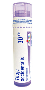 THUJA OCCIDENTALIS HOMEOPATHIC REMEDY FROM BOIRON. Thuja is a popular homeopathic remedy used to treat warts. It has also been indicated for spilt hair, dandruff, skin problems, torn muscles and joints and chronic urinary infections. Available in 30ch potency. [PELLETS]