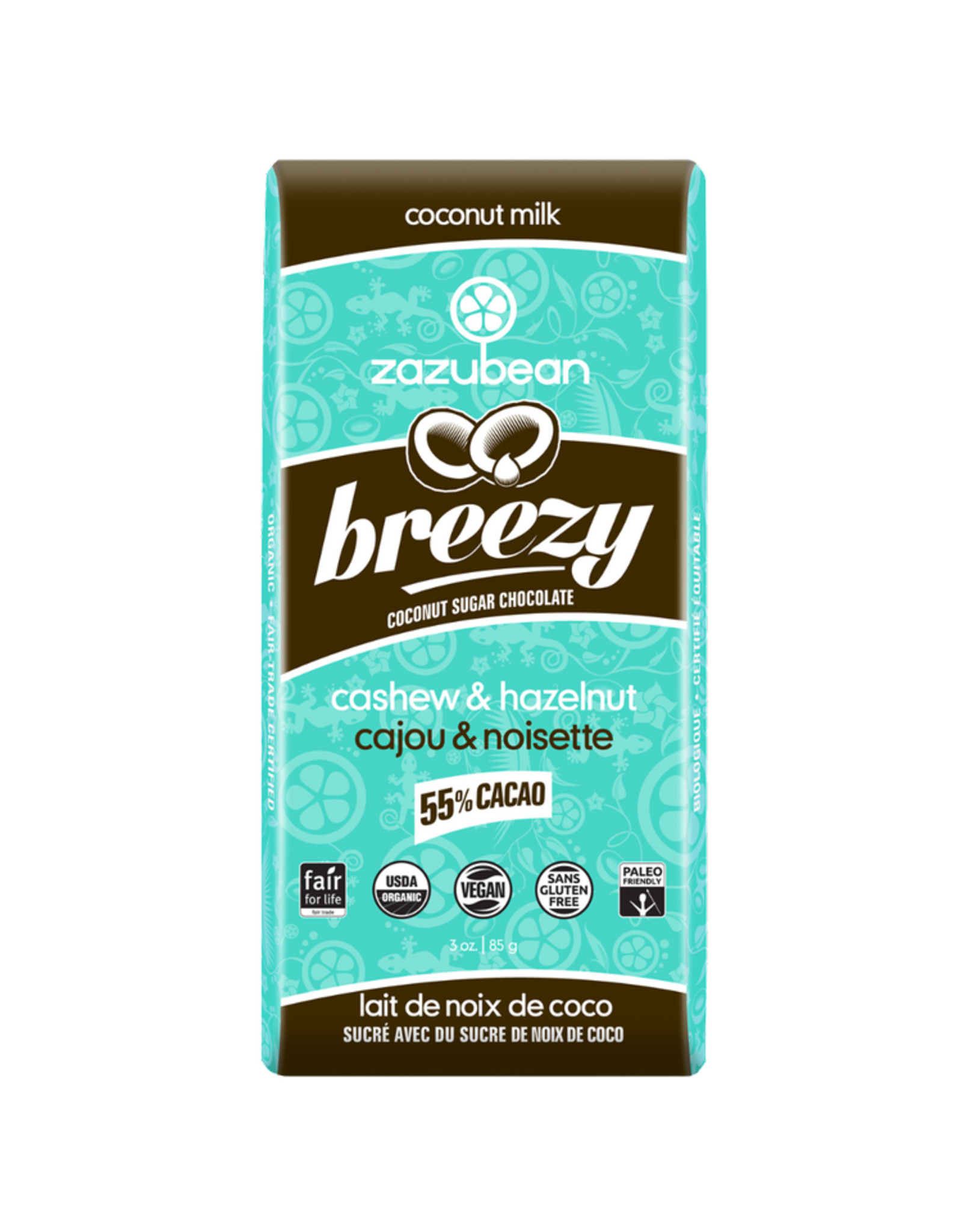 Ingredients: Coconut Blossom Sugar*+, Cocoa Mass*+, Cocoa Butter*+, Coconut Milk Powder*+, Cashews*+ , Hazelnuts*, Sea Salt, Vanilla Pods*+.