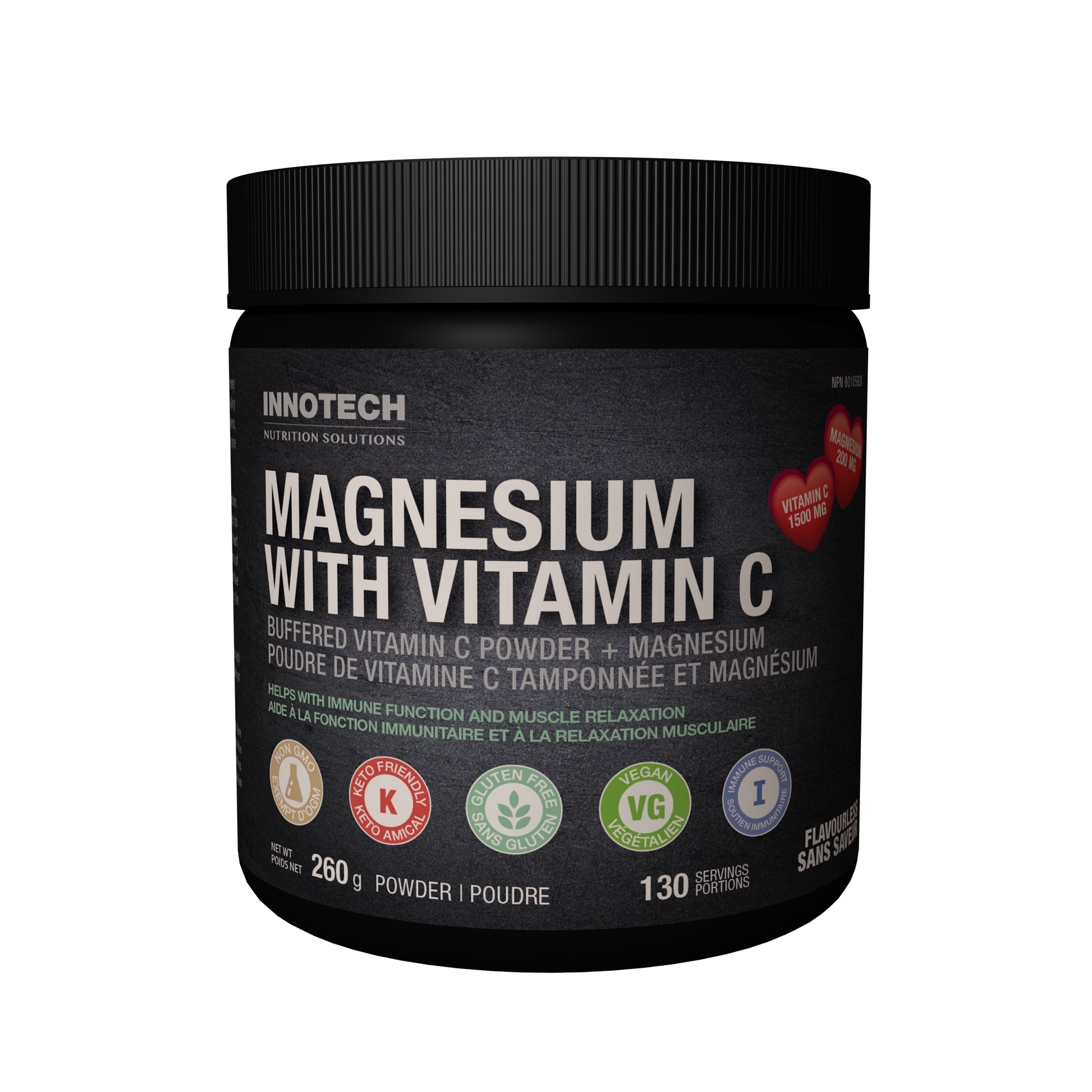 Innotech Nutrition’s pure Magnesium with Vitamin C is easy on your stomach, Vegan-friendly, non-GMO, non-dairy and free of sugar, salt, gluten, MSG, artificial sweeteners, artificial flavours and colours. The only ingredient is pure magnesium ascorbate (buffered vitamin c).