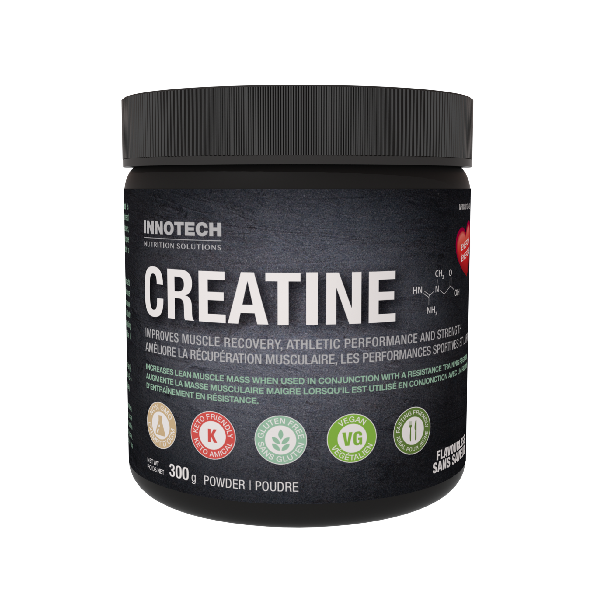 Innotech Nutrition’s pure Creatine Monohydrate is fermented, Vegan-friendly, non-GMO, non-dairy and free of sugar, salt, gluten, dairy, MSG, artificial sweeteners, artificial flavours and colours. The only ingredient is pure creatine monohydrate powder. Can easily be added to many other Innotech Nutrition healthy drink mixes to increase Creatine content like CardioFlex Q10, Fasting Days, Immune Essentials, Fermented Organic Greens and Fermented Plant Protein products.